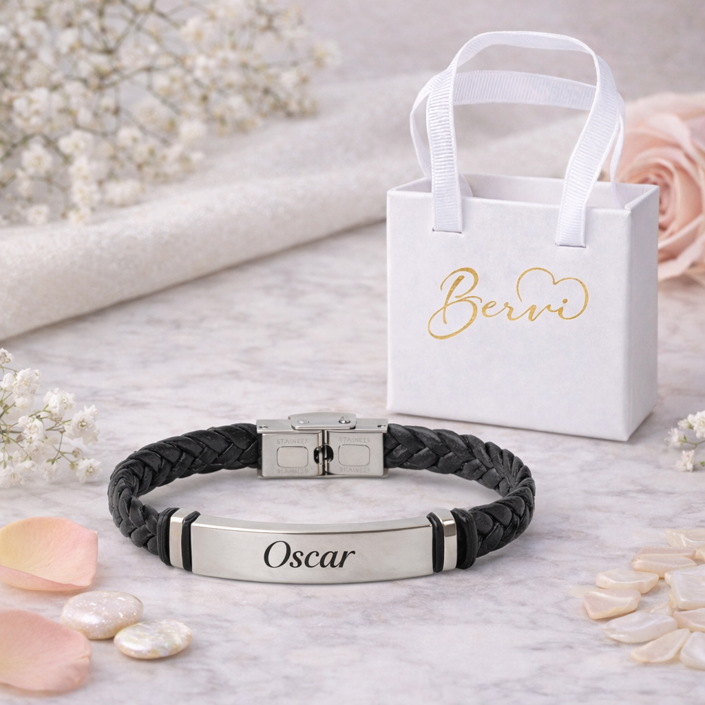 Pulsera de cuero trenzado negro con placa de acero inoxidable grabada a láser con el nombre o frase que elijas.